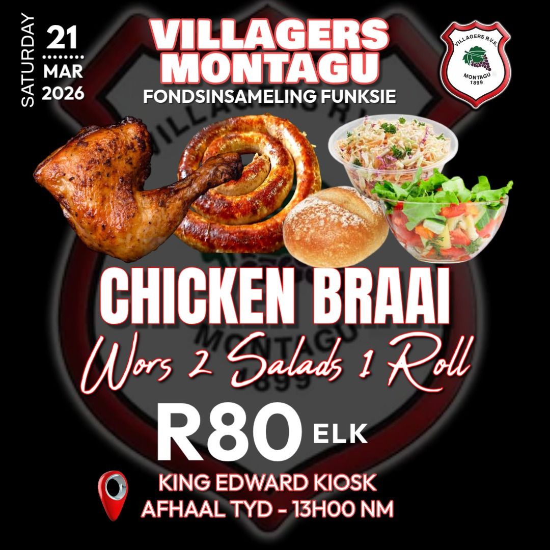 Join us for a delicious fundraiser to support Villagers RFC Montagu! On Saturday, 21 March 2026, we’ll be hosting a Chicken Braai with wors, two fresh salads, and a roll at King Edward Stadium Kiosks. Grab your meal from 1 PM and help raise funds for the club while enjoying a tasty treat. Don’t miss out – come support your local rugby team and enjoy great food with fellow fans!