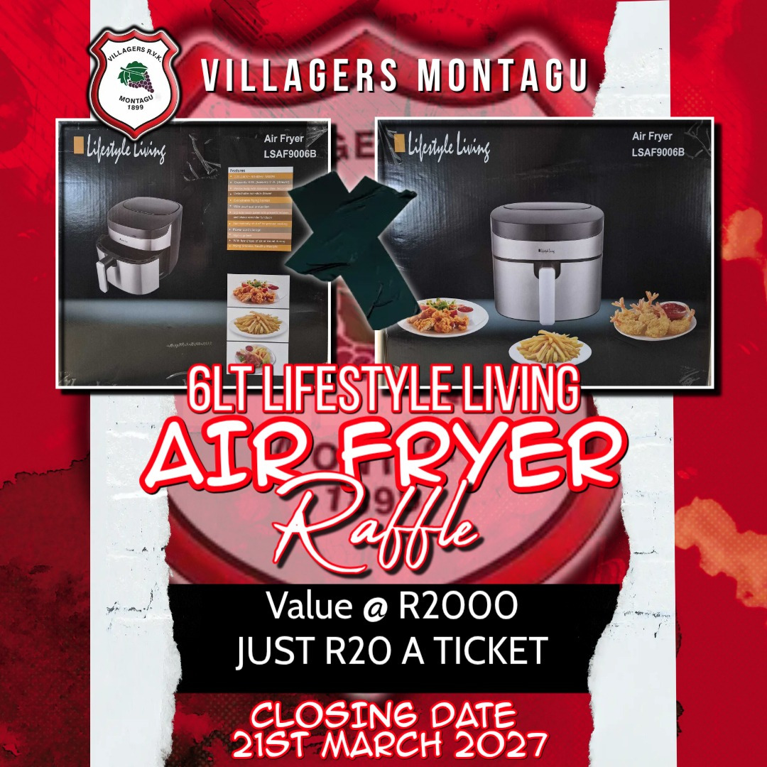 Get your chance to win an amazing Air Fryer valued at R2000 in our Villagers RFC Montagu fundraiser raffle! Tickets are only R20 each and can be purchased from our rugby players. The raffle closes on 21 March 2026, with the lucky winner being drawn during the 1st half of the 1st game at King Edward Stadium. Don't miss out – support your local rugby club and stand a chance to win big!